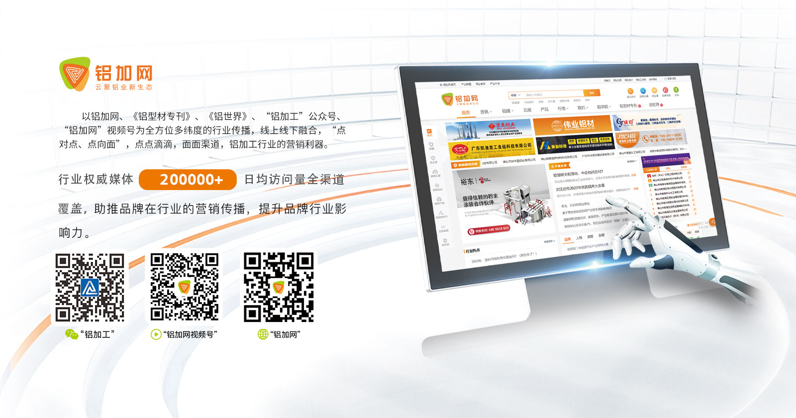 鋁加網(www.albiz.cn)是聞名鋁加工行業(yè)的垂直門戶網站,云聚鋁業(yè)新生態(tài),構建鋁業(yè)新場景,以albiz.cn 網站為核心,以移動云端、鋁加工微信、鋁加網視頻號、《鋁型材專刊》和《鋁世界》雜志為載體,成為了鋁加工行業(yè)資訊和精準傳播的首選傳媒。鋁加網,采集和發(fā)布全行業(yè)信息資訊,提供線上展覽、在線直播、短視頻、品牌策劃、品牌運營、品牌傳播等全方位的專業(yè)服務。